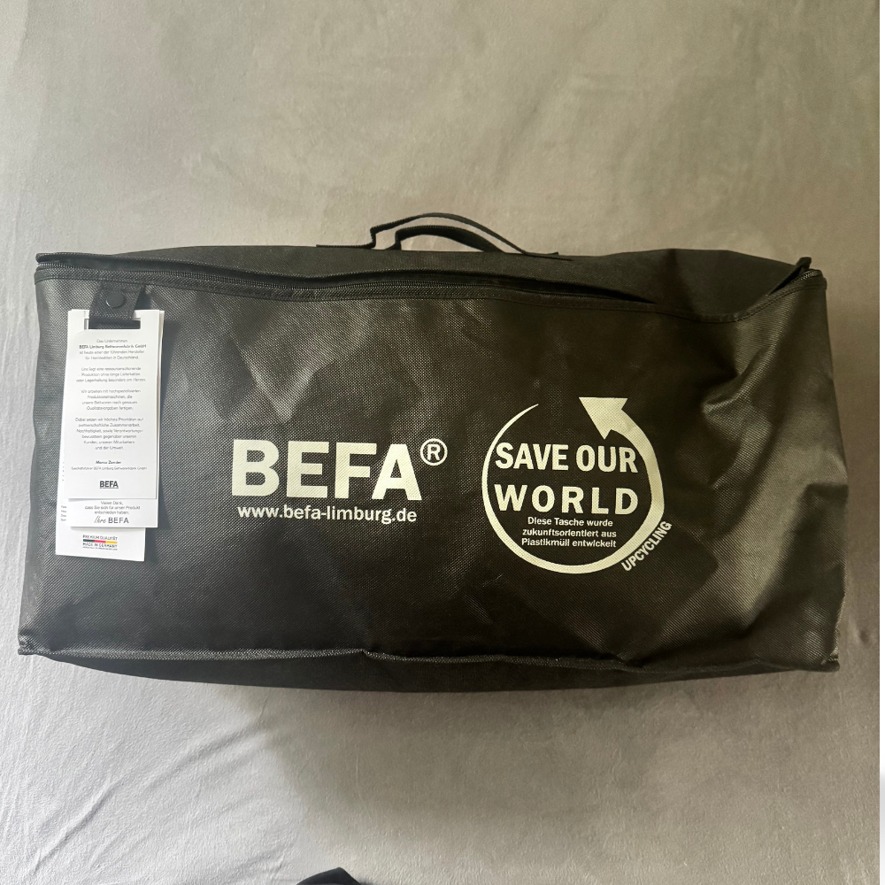 Die Werbematerialien des Daunenkissens sind ansprechend und hochwertig gestaltet, was die Qualität des Produkts unterstreicht. Die gezeigten Bilder und Darstellungen in der Werbung vermitteln einen authentischen Eindruck, der mit dem tatsächlichen Produkt übereinstimmt. Mit klar strukturierten Texten, die Vertrauen schaffen, und Hinweisen auf Zertifikate wie OEKO-TEX und NOMITE, wird die Qualität des Kissens zusätzlich betont. Auch die Verpackung, eine BEFA-Tasche mit dem Aufdruck „Save Our World“, korrespondiert mit den Werbefotos und hebt den Nachhaltigkeitsaspekt hervor.